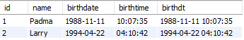 ('Padma', '1988-11-11', '10:07:35', '1988-11-11 10:07:35'),