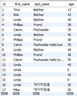 여기서 age가 null인 데이터만 출력하고 싶다면 is null 을 사용하면 된다.