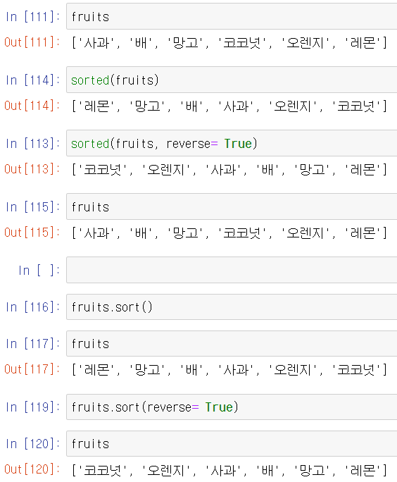 - 원래의 리스트 자체는 건들지 않고, 새롭게 정렬한 리스트를 반환하는 경우 : sorted()