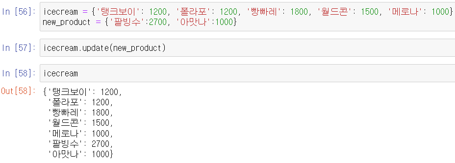 - update()를 사용해 딕셔너리에 다른 딕셔너리를 추가로 넣을 수 있다.