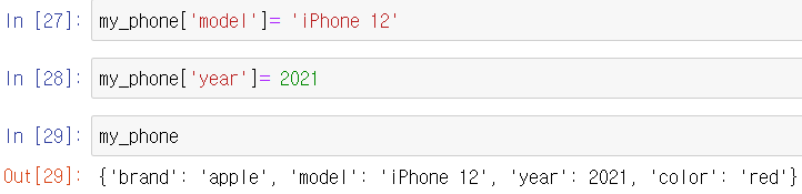 - dictionary[key] = value의 형태로 데이터를 추가할 수 있다.