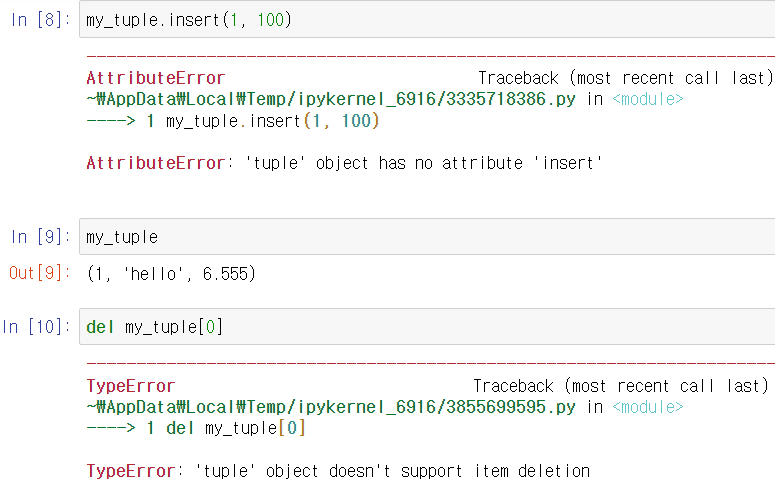 아래와 같은 튜플이 있다. 튜플은 데이터 추가, 삭제, 변경이 안되기 때문에 아래와 같은 에러가 발생한다.