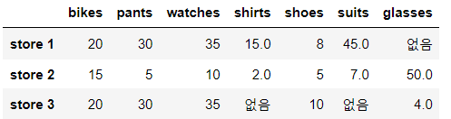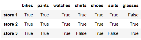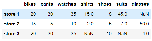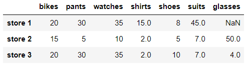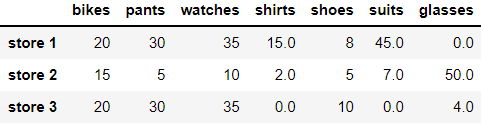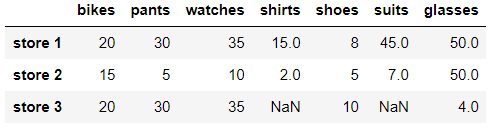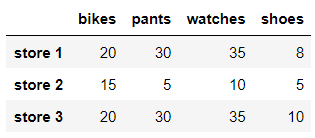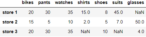 df = pd.DataFrame(data = items2, index = ['store 1', 'store 2', 'store 3'])