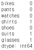 {'watches': 10, 'glasses': 50, 'bikes': 15, 'pants':5, 'shirts': 2, 'shoes':5, 'suits':7},