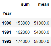 df.groupby('Year')['Salary'].agg([np.sum, np.mean])