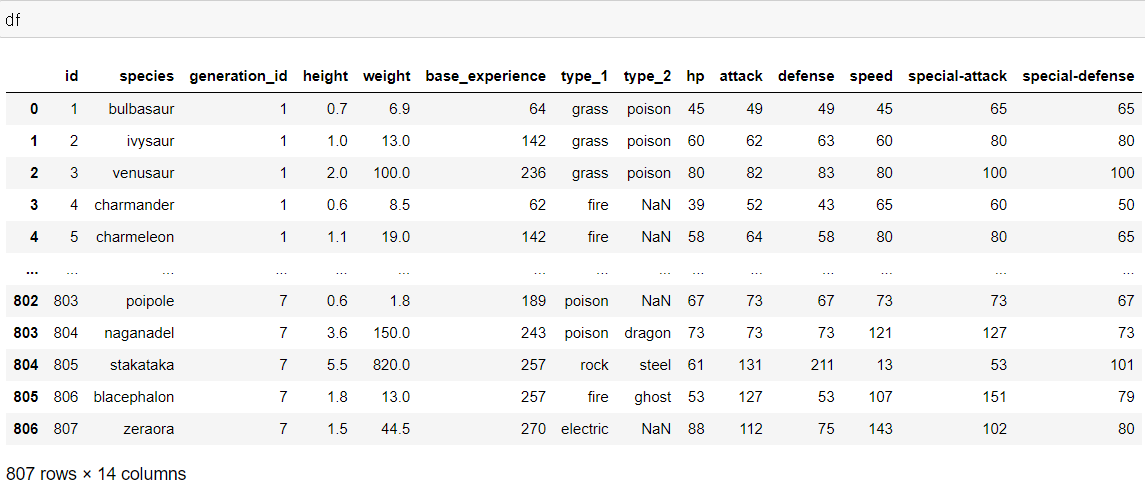 아래는 포켓몬 세대와 종에 대한 정보가 담겨있는 데이터 프레임이다.