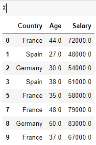 Country의 데이터들은 ['France', 'Germany', 'Spain']로만 이루어진 카테고리컬 데이터라는 것을 확인할 수 있다.