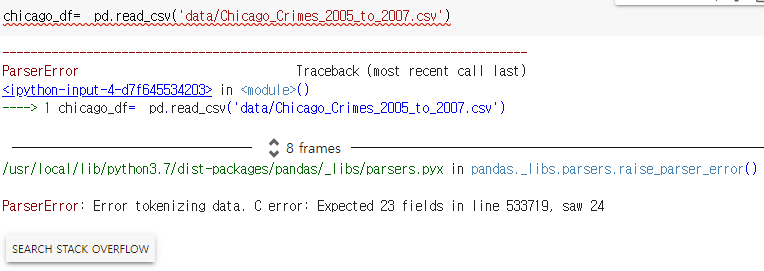 이럴때는 error_bad_lines=False 파라미터를 추가하면 에러가 나는 라인은 제외하고