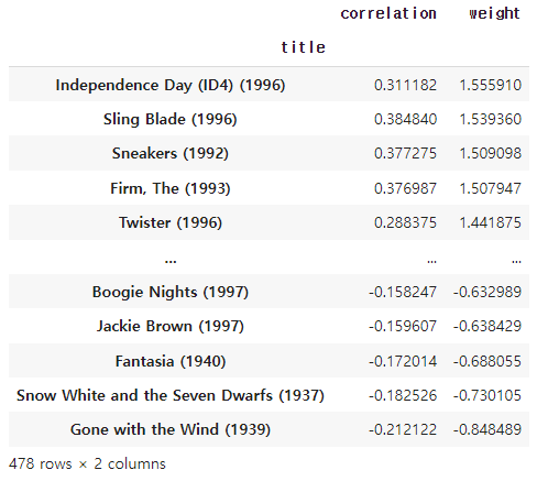 recom_movies['weight'] = myRatings['Ratings'][i] * recom_movies['correlation']